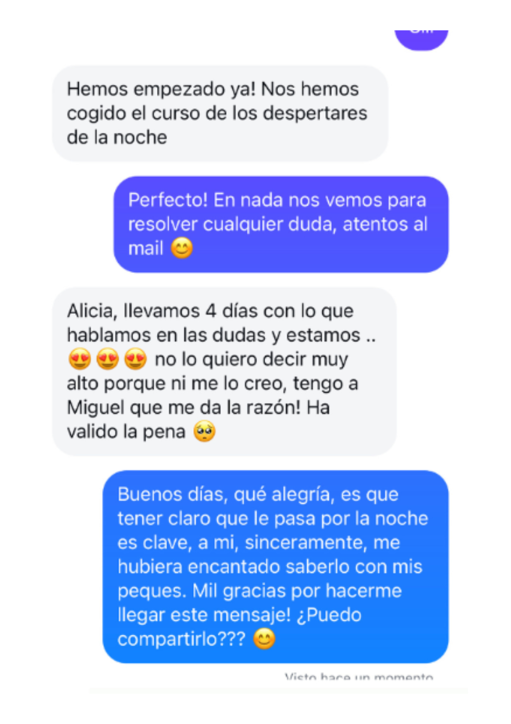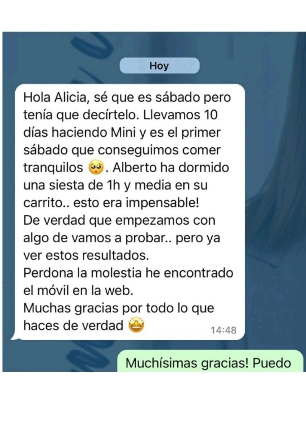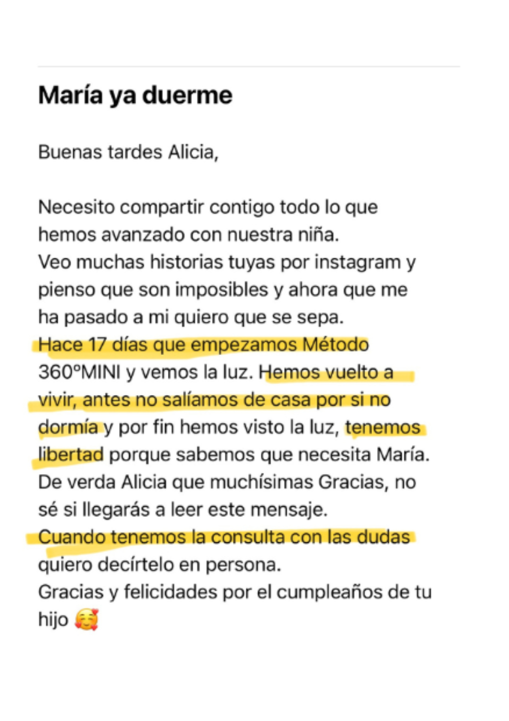 "El Método Descanso 360ºmini nos aportó paz mental, sabíamos qué era lo que necesitaba el bebé en cada momento.Teníamos una agenda bien estructurada de cara al bebé (Martí 4 meses) y sabíamos lo que teníamos que hacer en cada momento, cuándo ponerlo a dormir en las siestas, cuándo le tocaba comer. Eso nos dió flexibilidad en nuestra vida para poder vivir, antes sólo teníamos obsesión porque durmiera, no dormía y ni salíamos de casa"